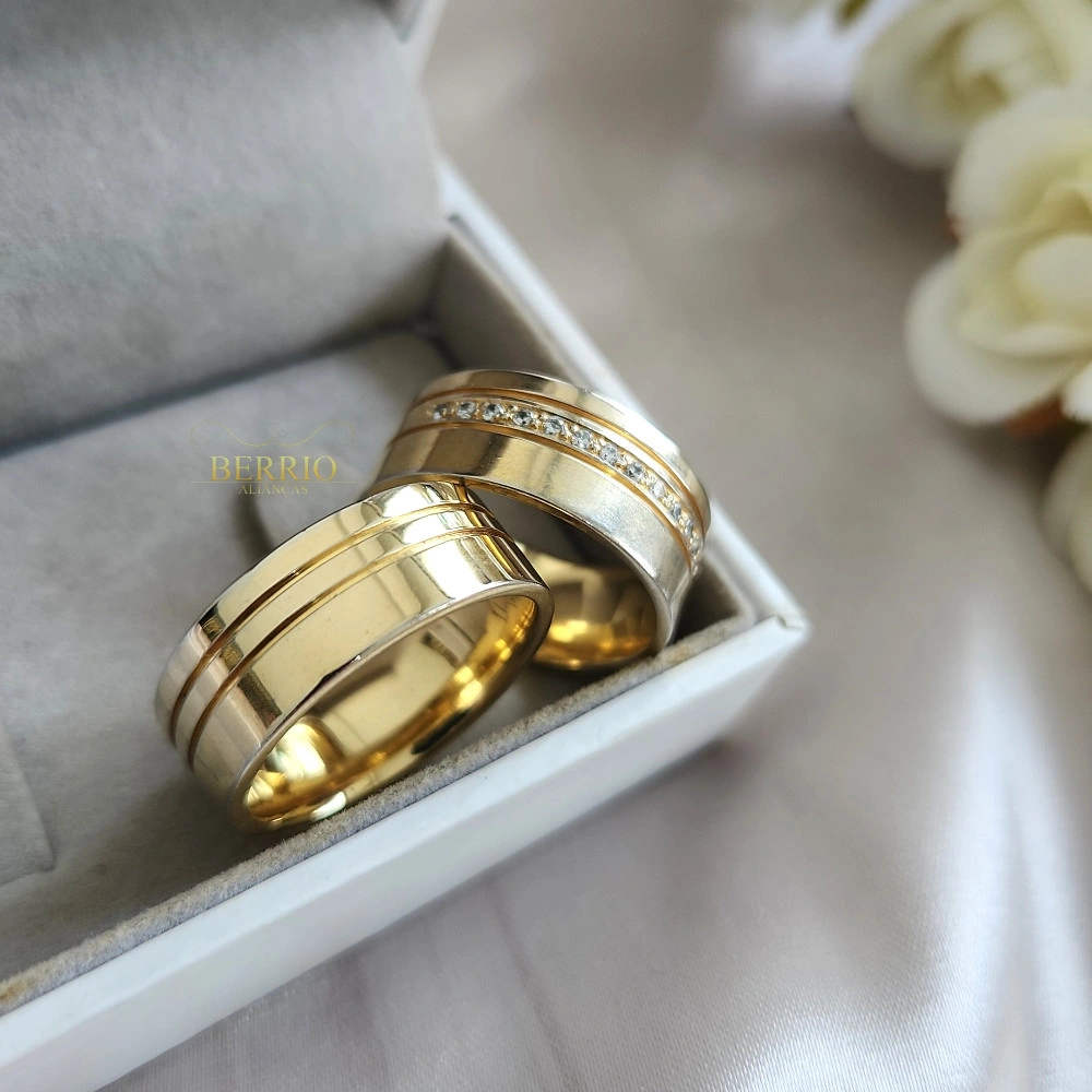 Cravejadas com 15 pedras estrategicamente posicionadas, essas alianças garantem um brilho sutil e refinado. Seu acabamento polido intensifica a beleza e a durabilidade da peça, proporcionando um toque especial de exclusividade. Além disso, a gravação a laser permite personalizar com nomes, datas ou frases que eternizam momentos especiais.